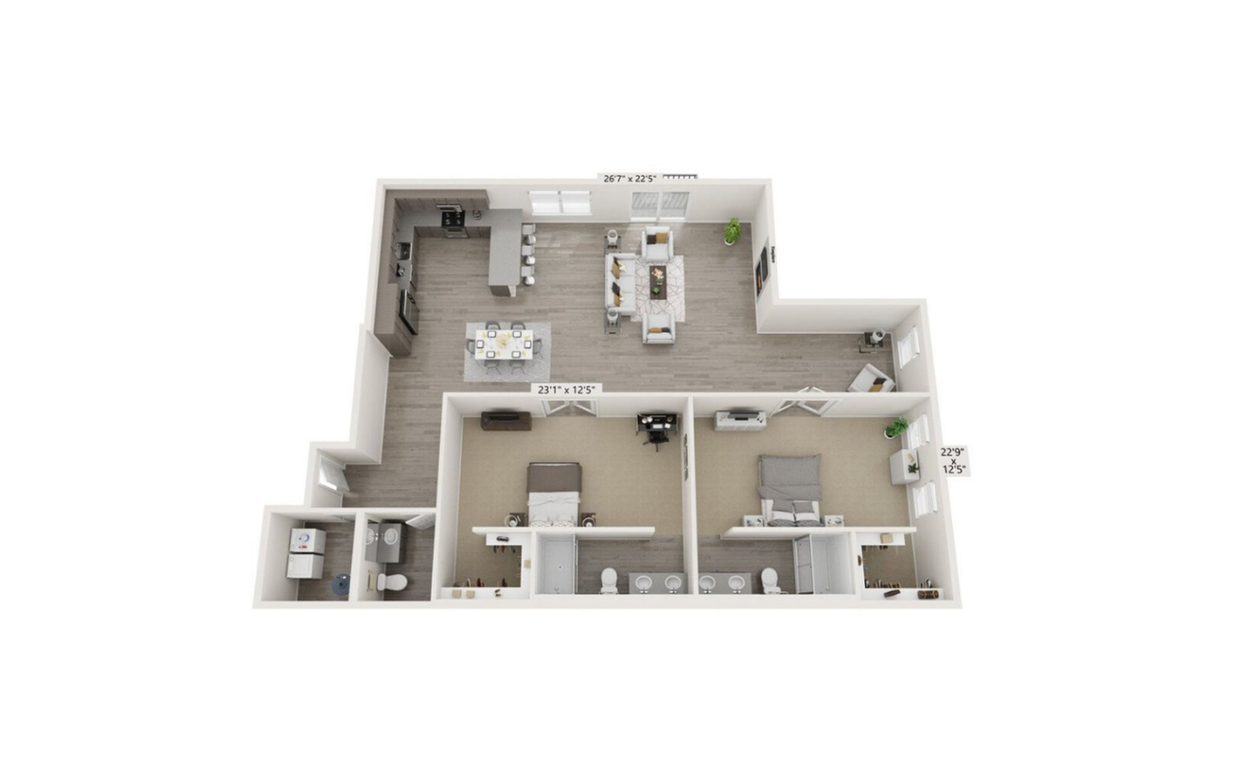 High ceilings and oversized windows flood each apartment with light, while open-plan kitchen and living spaces keep everything connected and effortless. Hotel-style bathrooms with their walk-in showers and spacious vanities offer a touch of indulgence, with select apartments offering exposed brick walls, double-door refrigerators with water dispensers, and an expansive kitchen island for easy meal prep.